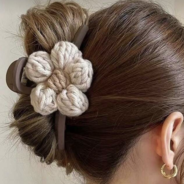 Grosse pince pour cheveux décorée d’une fleur en maille tricotée , alliant style et confort. Facile à positionner, elle maintient les cheveux tout en apportant une touche originale et élégante à vos coiffures.